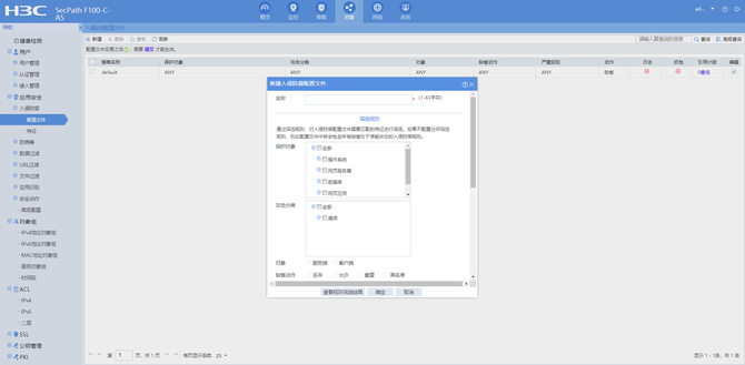 在“对象”模块,用户能够对用户进行管控,其中包括用户管理、认证管理、接入管理等。此外通过该模块还能够对应用安全策略进行配置,譬如入侵检测、防病毒、数据过滤、URL过滤等策略的配置。 H3C F100-C-A5防火墙还能够支持IPv6 ACL、Radius等安全技术。