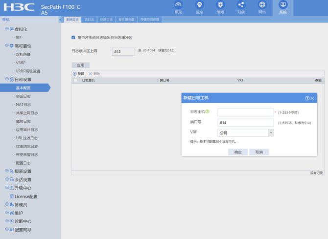 通过“监控”模块,能够查看防火墙设备的安全日志,H3C F100-C-A5防火墙基于先进的深度挖掘及分析技术,采用主动收集、被动接收等方式,为用户提供集中化的日志管理功能,并对不同类型格式(Syslog、二进制流日志等)的日志进行归一化处理。同时,采用了高聚合压缩技术对海量事件进行存储,并可通过自动压缩、加密和保存日志文件到DAS、NAS或SAN等外部存储系统,避免重要安全事件的丢失。
