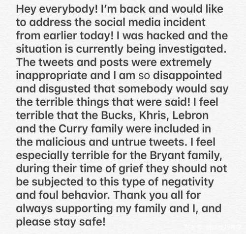 “嘿大家好!我回来了,也想为今天早些时候社交媒体上的一些事情做些澄清!我被盗号了,目前这件事正在调查中。那些发布的推文和图片是极其荒谬的,对于一些人说的那些话我感到十分失望和厌恶!我为雄鹿队、克里斯(米德尔顿)、勒布朗(詹姆斯)和(斯蒂芬)库里家庭都被那些不切实际的推文涉及到其中感到很悲伤和歉意。我也为科比(布莱恩特)的家人们感到特别难过,在如此悲痛的时候,他们不应该受到这种消极和恶劣行为的影响。感谢所有人对我和我家人的支持,也希望大家注意安全!”