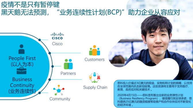 根据卜宪录介绍,思科在今年4月份宣布推出业务弹性计划(Business Resiliency Program),该计划旨在帮助客户和合作伙伴应对不断变化的经济环境,缓解因新冠疫情带来的财务挑战,为企业提供所需的解决方案,使企业能够在当前这一特殊时期保持业务高效运营,保障员工安全,并为社区提供支持。