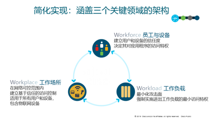 根据介绍,思科倡导的整个“零信任”安全架构是建立信任度、实施基于信任度的访问以及持续的信任验证这三步循环的过程。思科“零信任”安全架构会根据不同用户在这个三个关键领域架构中的不同情况,给予不同的认证和授权,从三个“W”的角度分阶段实现: