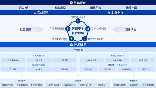 白皮书在对现阶段全球数据安全产业发展格局及治理态势进行充分调研与深度剖析的基础上,从引导企业建设与升级数据安全治理体系的视角出发,以“战略要位、实战牵引、全员参与、技术破局”为核心指导思想,强调数据安全的“复合”治理,即:对治理框架搭建中战略、管理和技术进行统筹规划与设计,形成基线设定、心智运营、原生设计、安全度量、可证溯源、红蓝对抗、测评认证等丰富的治理环节,强化治理过程的联动,将安全与业务复合、管理与技术复合,形成有机整体,充分发挥复合协同效能,构建体系化、准确量化、持续优化的数据安全复合治理模式。