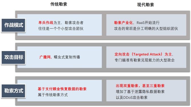 现代勒索攻击的转变升级主要体现在作战模式、攻击目标和勒索方式上。首先,勒索即服务RaaS(Ransomware-as-a-Service)的兴起使得勒索的作战模式从传统的小型团伙单兵作战,转变为模块化、产业化、专业化的大型团伙作战,其造成的勒索攻击覆盖面更广,危害程度显著增加;其次,对于勒索攻击的目标,也从过往的广撒网蠕虫式攻击升级成为针对政府、关键信息基础设施、各类企业的定向攻击;另外,从勒索方式来看,现代勒索攻击已经从传统的支付赎金恢复数据的勒索方式,演化为同时开展双重勒索,甚至三重勒索。