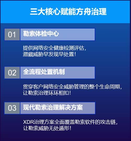 现代勒索治理解决方案:基于亚信安全成熟的XDR技术,现代勒索治理方案可全面覆盖勒索病毒的攻击链,通过“事前预防、事中处理、事后扫雷”三大手段,构建立体化、平台级的运营防护能力。