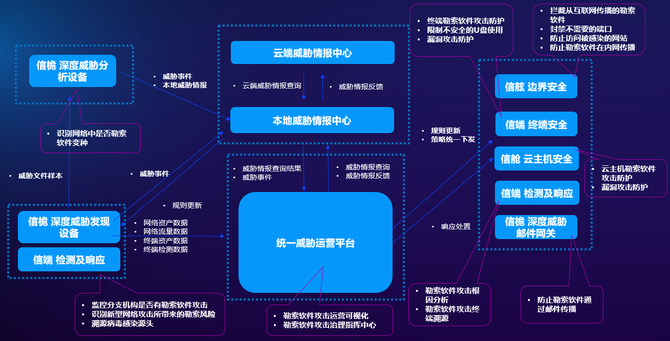 勒索体检中心:亚信安全运营团队通过部署端点及网络探针,对勒索攻击进行全面排查分析,帮助客户防范在前,早发现、早预警、早研判、早处置。利用最新的勒索威胁情报进行数据碰撞,确认企业环境中是否存在勒索行为,将勒索攻击爆发风险降至最低。