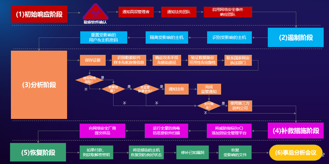 亚信安全副总裁刘政平介绍:“勒索病毒攻击可以分为6个阶段,包含初始入侵、持续驻留、内网渗透、命令控制、信息外泄、执行勒索,而单一防御安全体系很难对这种有别于传统病毒的‘杀伤链’发挥作用。”