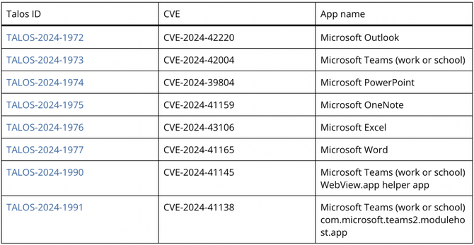 尽管存在这些风险,Microsoft认为这些问题风险较低,并拒绝修复,理由是某些应用程序需要允许未签名的库以支持插件。Talos提供了这些漏洞的列表,并附带了相应的Talos ID和CVE。