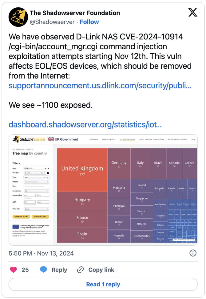 Shadowserver Foundation的研究人员观察到,从11月12日开始,便有人尝试利用CVE-2024-10914漏洞。专家们发现,约有1,100台面向互联网的设备可能受此问题影响,其中大部分位于英国、匈牙利和法国。